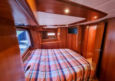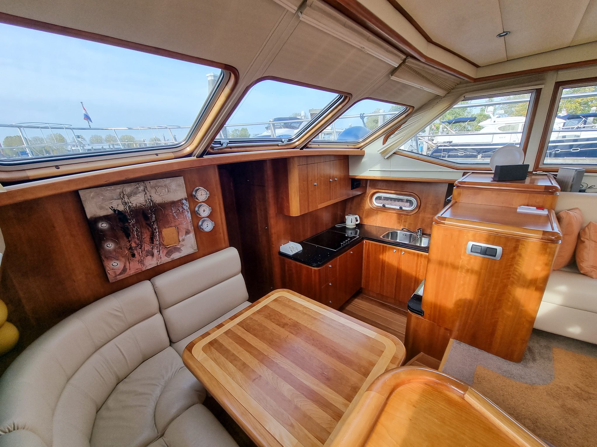 Het achterdek beschikt over infrarood verwarming waar je aan de royale kuiptafel heerlijk kan aanschuiven. Vanuit het stuurhuis kan je door de grote ramen alles overzien. Is dit nog niet goed genoeg? Dan kan je met de 8 camera’s de boot goed in de gaten houden. Tevens is dit geïntegreerd met een app op de telefoon zodat je ook op afstand op de hoogte kan blijven.